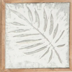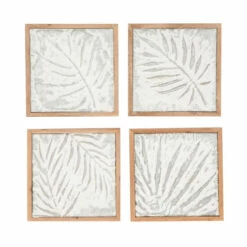 Elevate a rustic themed home with this metal wall art in wood frames. The wall decor set features four panels of fossil leaf imprints with a white and gray finish. Each metal panel has a wooden frame made from Chinese fir with a natural brown finish. Use as charming wall accents to highlight the warm and cozy touch of farmhouse interiors. There are keyholes on the back for easy hanging. Suitable for indoor use only. This set includes four panels. This item comes shipped in one carton.