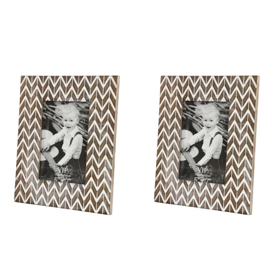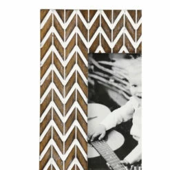 This rectangular wooden picture frame has a Polynesian style with its mocha brown-colored Chinese fir and red pine woods that feature a chevron pattern with antique white glaze for bold contrast. This wood frame makes for a bold accent piece with a global design aesthetic while maintaining neutral hues and natural materials to suit any color palette and home decor style. Ships in 1 carton. Easel stand backing with secure hardware for stability. Suitable for indoor use only. Photo frame can hold 1 picture with 5″x 7″ frame opening. Modern design.