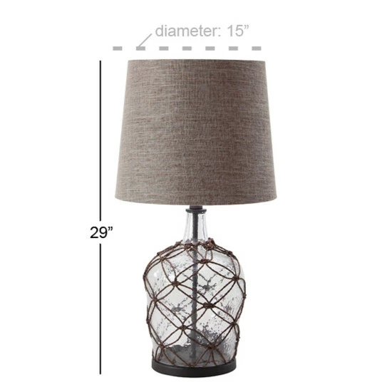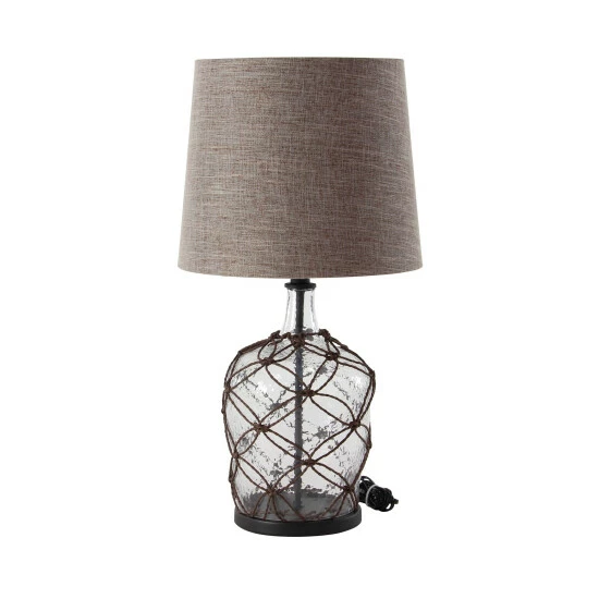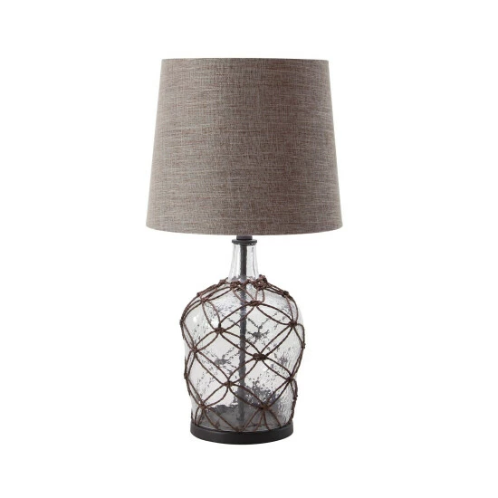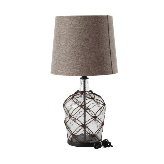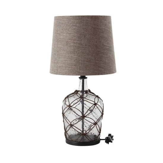 - This accent table lamp is crafted of durable glass, linen, iron, rattan, and plastic