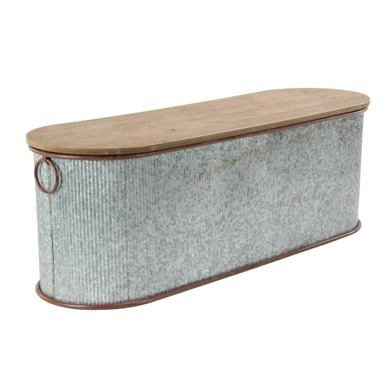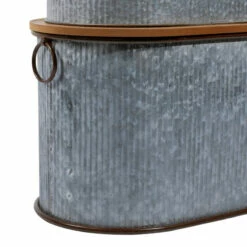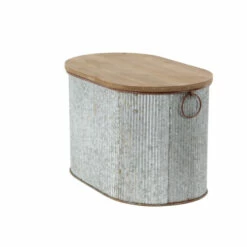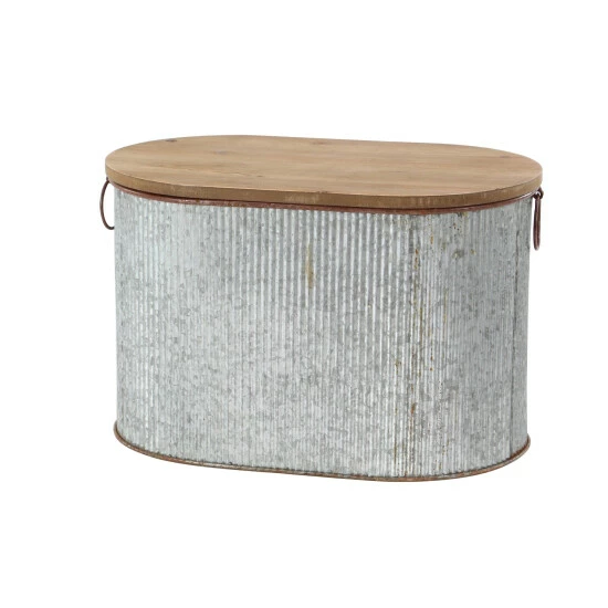 - This farmhouse style inspired brown iron and woos storage box set features an oval shaped body made from galvanized metal with a wooden lid furnished with ring handles on the ends
