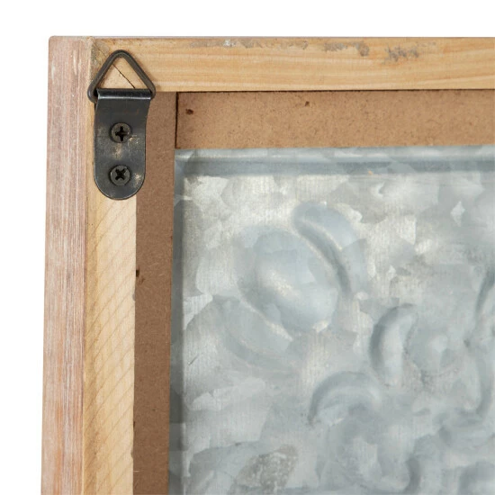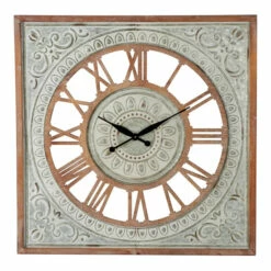 Be it a farmhouse or French province style room, this square wall clock will be a pleasant addition. It carries a galvanized iron body and a wooden frame. Intricate details are embossed on the iron for emphasis on its theme. Roman numerals represent the hours of the day. This clock runs on a single AA battery that is not included in the package. Hang it via the metal backings on the two upper corners. The sides measure 36″ each.