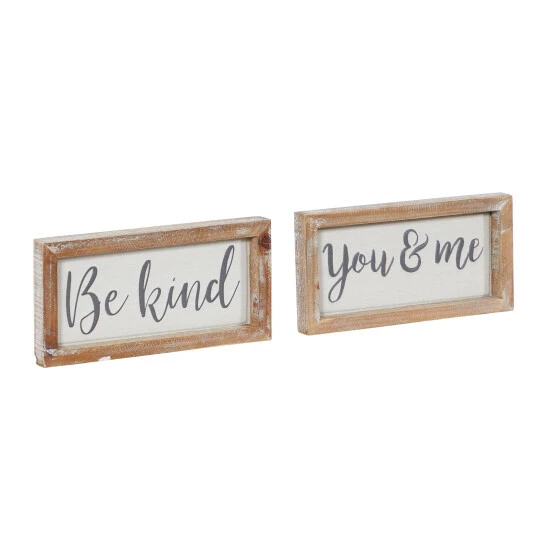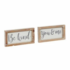 There will be no need to look for inspiration and motivation with this decorative wall art piece. The set of rectangular wall signs made from natural wood with a distressed brown frame features motivational calligraphy of “Be Kind” and “You and Me” written on each signage. Hang on walls of modern bedrooms, nooks, living rooms, and any space in need of inspiration. Items feature sawtooth hardware for easy hang. This item comes shipped in one carton.