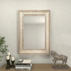 This large rectangular wood and metal wall mirror is sure to add rustic simplicity with farmhouse charm to any wall of your home or office. A textural whitewashed finish coats the Chinese fir wood and metal mirror frame with two border designs, including carved squares and groove lines. The neutral hues of this accent decor will work with any color palette or pattern and adds rich dimension to any space. A loop hardware is placed at the back section for easy hanging via nail or screw. Suitable for indoor use only. This item comes shipped in one carton.
