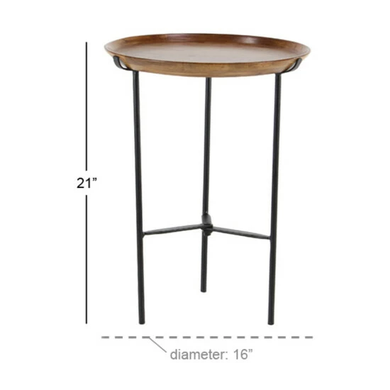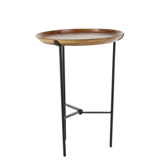 - This round wood and metal side table features a nice round wooden tray for its surface placed on a solid metal tripod frame