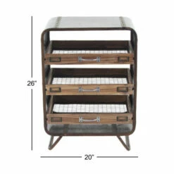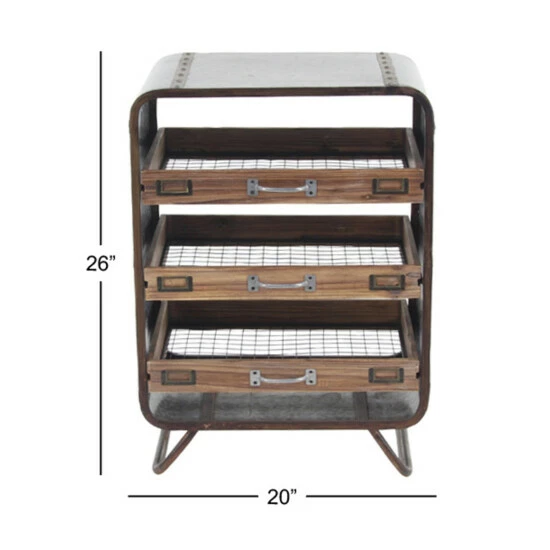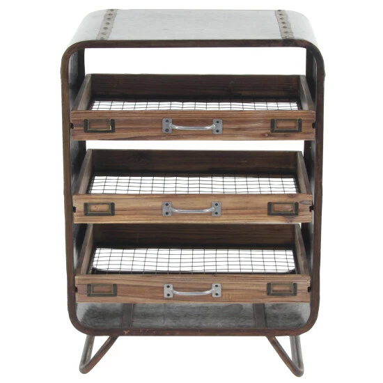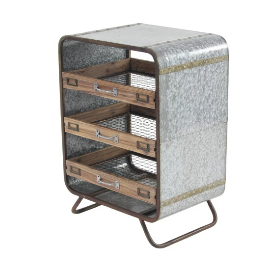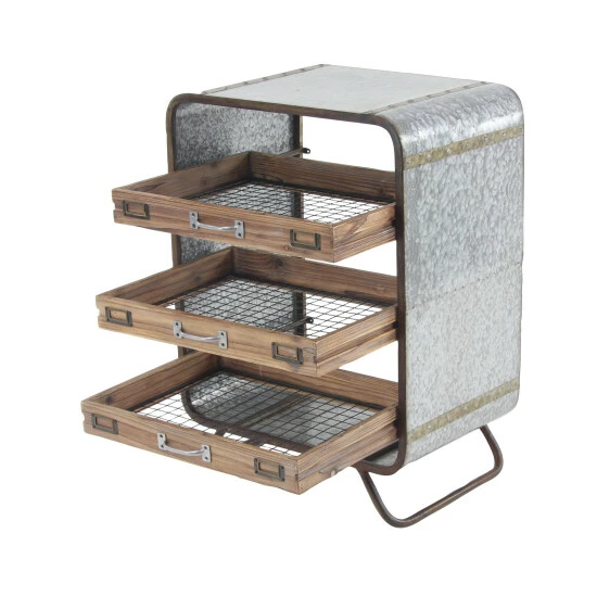 - This industrial metal and wood tray chest features gray rectangular frame with brown slide-out drawers