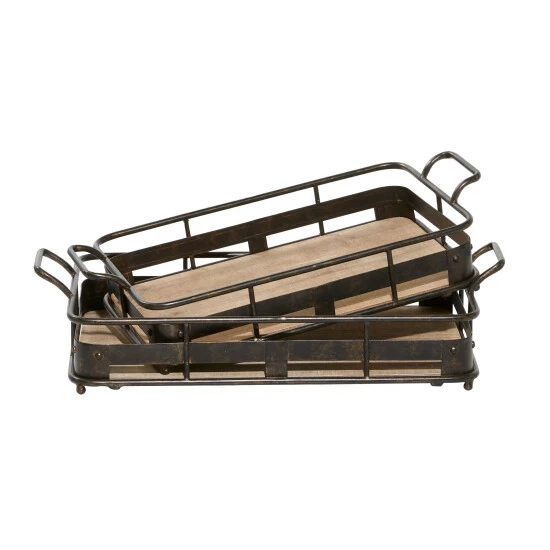 These brown metal and wood trays set with handles lend a modern and vintage vibe for your farmhouse-themed home. Each rectangular tray is made with a board wood base and a metal frame with 2 side handles and a brown natural finish. Use as individual or set of serving trays or as décor holders on your coffee, console, and kitchen tables, these decorative trays sure are cool and rustic additions to your contemporary and traditional home spaces. Please note that this item is for decorative purpose use only and are not food safe.This item ships in one carton