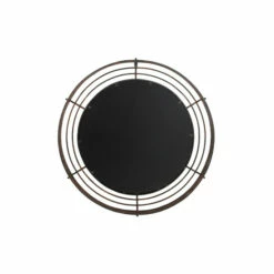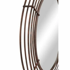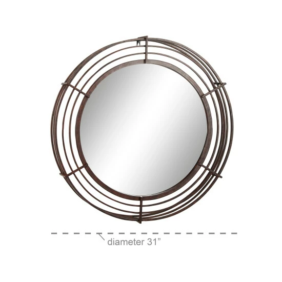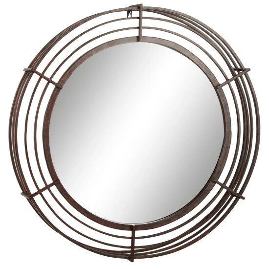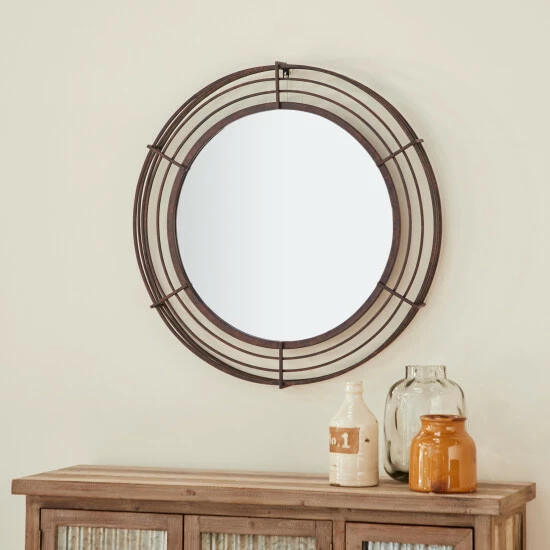 Add dimension with Industrial style to your space with this large round wrought iron wall mirror. The front frame of this large mirror displays rows of bronze, textured iron bars that form a cage-like structure around the glass mirror. From the profile view, you’ll find additional iron bars jutting out 3″ where they connect at a 90-degree angle to the front bars, creating an industrial pop-out effect from your wall. The textured, distressed finish creates a bronze hue from the black and brown matte paint over the iron bars, a perfectly industrial look that looks especially dynamic against exposed brick and above the wood and metal furniture. Welded iron keyhole hanging hardware. Suitable for indoor use only. This item comes shipped in one carton.