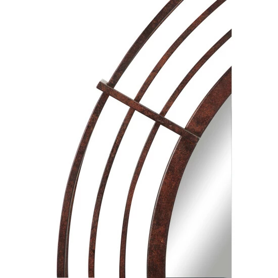 - This round metal wall mirror features a reflective glass finish and a rusted brown metal finish