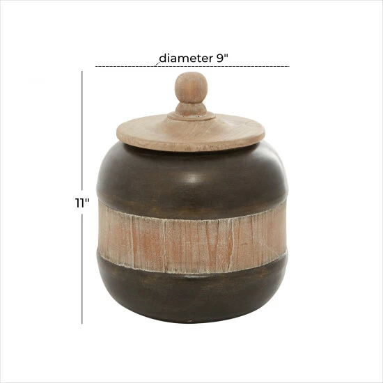 Amplify the ambiance of your space with this small round jar that can declare your home style. This piece is designed to offer any rustic themed home a final touch. This brown decorative jar is made out of metal and fir wood, hence it will remain in pristine condition for the years to come. With its remarkable characteristics, you can show off this incredible home decorโfeaturing a small round metal and wood decorative jar with lid and handle. It also comes in dark brown and light brown finishes. Let this accent piece provide a sense of style to your home atmosphere by displaying it on top of a shelf, countertop, mantel, or an accent table.
