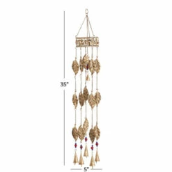 Made in India, this gold-colored wind chime is the perfect gift for nature lovers. Detailed metallic leaves dangle from the crown, suspended by a series of chains. At the bottom of the wind chime, glass beads and small bells add an elegant finishing touch. Add this decor to your garden or patio to delight visitors, or hang it indoors in a boho-style room. This item comes shipped in one carton. Designed for safe and easy installation with metal chain and ring. Suitable for indoor and outdoor use. Made in India. Traditional style.. Crafted in a traditional style that fits great in most homes. This windchime is made of solid metal for durable and long lasting use. Metal windchime showcases a semi shine gold finish with multi color beads. This whimsical windchime brings a soothing element into any space with its delicate and airy structure attached to a chain ring for convenient hang. This item measures 5″L x 5″W x 35″H and weighs 1 lb.