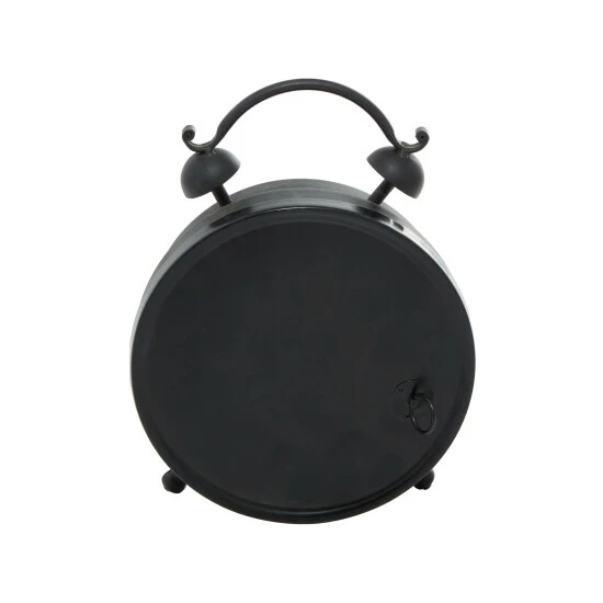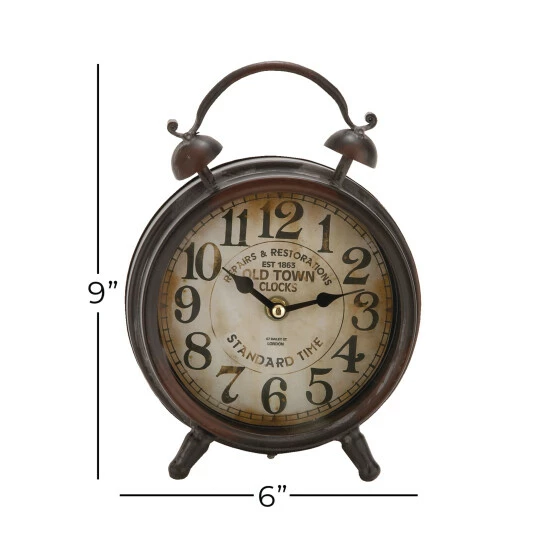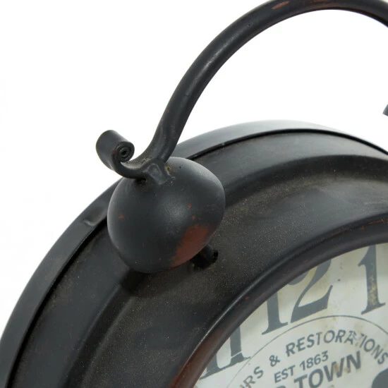 Stay on time all the time by adding this vintage-style clock to your bedroom. The round iron frame features a distressed finish and is supported by two peg feet. Decorative top bells and a connecting arch give the clock an iconic silhouette. The clock’s face reads “Old Town Clocks” in a faded font and includes large numbers to indicate the time of day. It looks great when paired with rustic- or industrial-style decor. Designed with black rubber stoppers at the base that prevent scratching furniture and table tops, as well as sliding around. Requires 1 AA batteries. Not Included. This item comes shipped in 1 carton. Features Arabic numerals for the hour and minute markers. The clock mechanism runs silent. Suitable for indoor use only. Clock face with text “Repairs & Restorations EST 1863”, “OLD TOWN CLOCKS”, “Standard Time”. Vintage inspired.