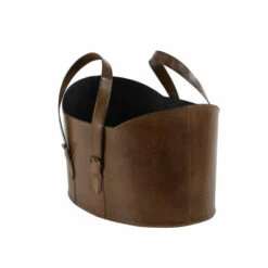 - These leather magazine racks feature oval receptacles, angled rims, and strap handles with buckles
