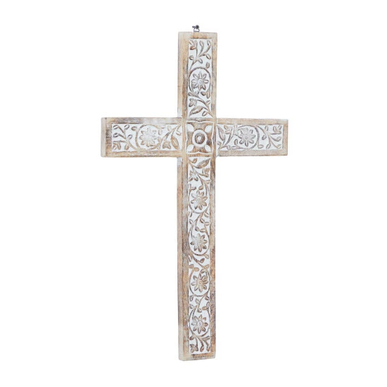 Add a touch of spirituality to your space with this gorgeous cross wall decor. Made in India, the decorative cross features elegant floral patterns carved on a mango wood body. The cross is 24″ tall and 15″ wide, making it an eye-catching addition to your wall. A beige and brown finish allows it to fit in with traditional- or rustic-style decorating schemes. This item comes shipped in one carton. Item comes with metal loop for easy and secure hang. Suitable for indoor use only. Made in India. Traditional theme. Wood wall decor makes a great gift for any occasion.