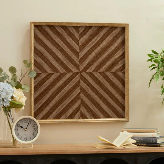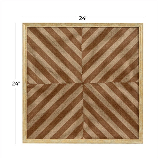 Add a vintage boho, crafty style to your home or office with this dimensional abstract art! A textured beige and golden brown wood frame houses several rows on tan and warm brown cotton string forming a striped “X” design. These earthy tones and the yarn craft vibe create a vintage, homemade look. These earth tones are also very neutral, so will work with most color palettes. This item ships in 1 carton. Easily hanging using hanging loop hardware on the back. Suitable for indoor use only. Contemporary design.
