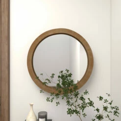 - A wooden frame encases and supports the inset mirror of this wall display