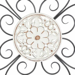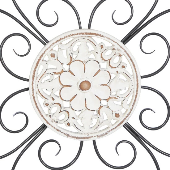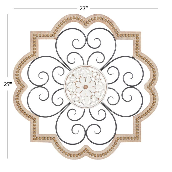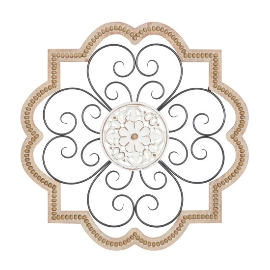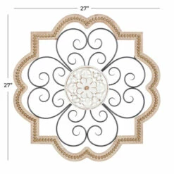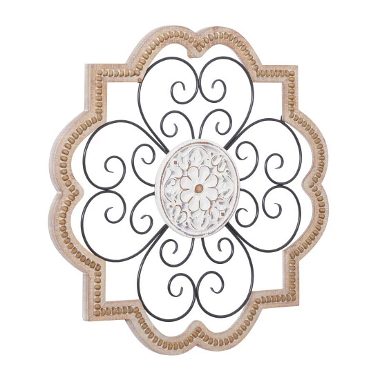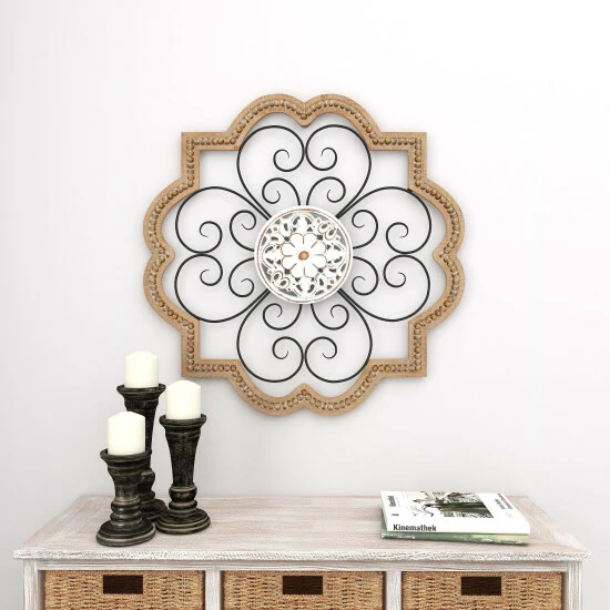 - The decor features a wood frame, a middle layer of scrolling metal designs, and a floral design in the center