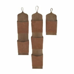 This 3-piece set of dark brown wood wall panels with faux leather pouch holders will complement your traditional inspired home. Featuring a dark brown finish on the faux leather and the wood panels, this piece will command attention in any room you hang it. It has a small circular handle dedicated for hanging. The faux leather is fastened securely onto the wooden panels to make sure that it can carry the weight of the things you will put in it. This pouch holder is great for mail but can also be useful to store your magazines or small pocket books. This item comes shipped in one carton. Ready to hang with attached D-ring hardware. Suitable for indoor use only. Each hooks holds 5 to 8 pounds. This is a 3-piece set of wall pocket organizers. Rustic design.