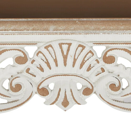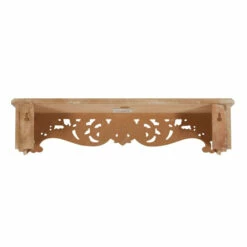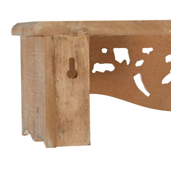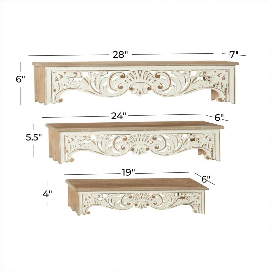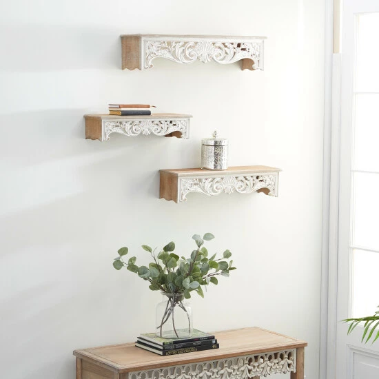 The natural warm beige wood shelves with front carved ornate patterns bring country cottage and French country vibes to any room. Your wall decor ideas make the rules with these elegant wood shelves, no matter where or how you hang them—in the kitchen, living room, bedroom, or entryway. Versatility runs in its design and material, making the shelves perfect for accent Decor, small potted plants, framed memories, or other home decorations. This item comes shipped in one carton. Easy to hang with carved 2 back keyhole hooks. Suitable for indoor use only. Holds up to 20 lbs. Each set comes with 3 wooden vintage shelves. Vintage inspired.