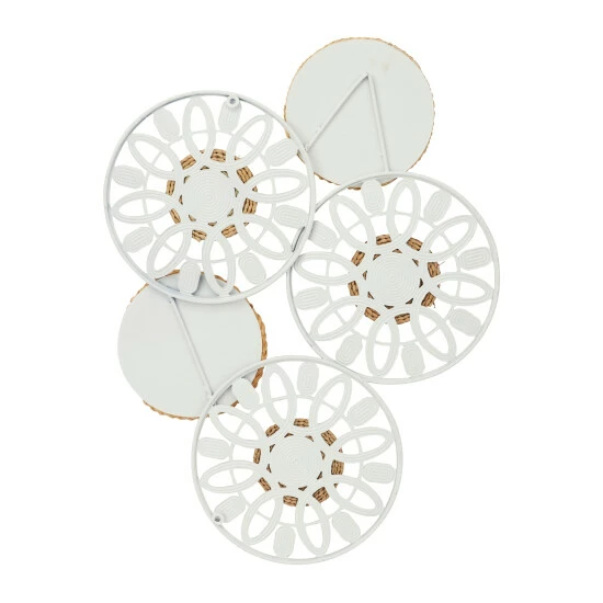 - A bohemian wall decor featuring brown spiral corn husk details with cut out flower inspired white metal frames
