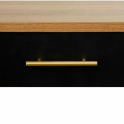 - Natural wood brown finish highlights the tabletop of this accent table with black frame and gold handles