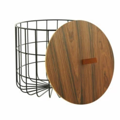 - A black body frame highlight the natural wood brown polished lid of each of these wire storage baskets