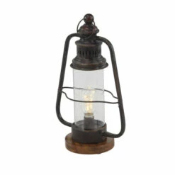 Infuse your space in the romantic light glow that emits from this industrial lantern with light bulb. Delight your guests and make any occasion extra special by adding a lighted or flameless candle to this lantern. Made with a sturdy base, it is perfect for creating an elegant atmosphere at your table top or mantel. Runs on one AA battery (not included). Brown metal lantern with fixed electric bulb. This is an LED lantern and does not hold candle. This item comes shipped in one carton. Non-removable top may be used as a hanging lantern. The non-removable top with metal ring may be used for hanging. Suitable for indoor use only. Runs on one AA battery located under the base with an on/off switch. Designed with an industrial theme.