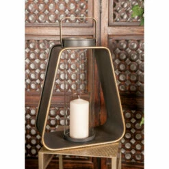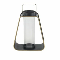 Elevate your living space with this metal and glass lantern. This lantern features an open-style rounded trapezoidal iron frame with a polished bronze finish for an outstanding look. It includes a cylindrical clear glass candle shade designed for votive candle types. It also comes with a thin square black iron handle for extra convenience. This lantern is crafted from iron and glass that guarantees a long-lasting use. Aside from its functional use, it also makes a great and striking décor to your rustic and industrial home settings. Get this stunning piece today at an affordable price!