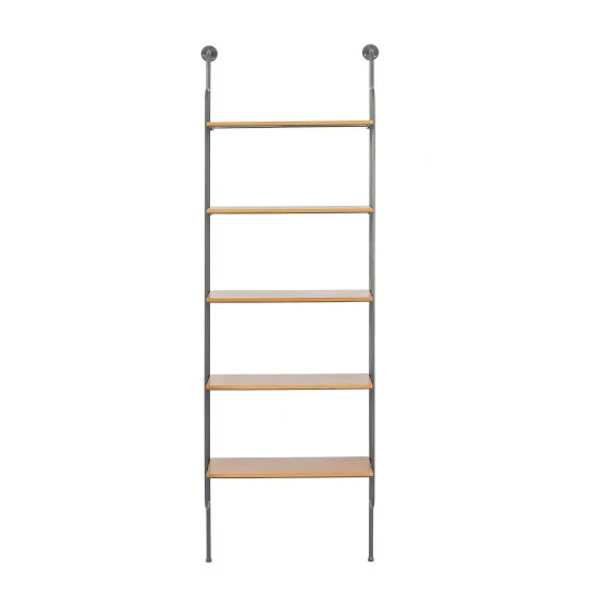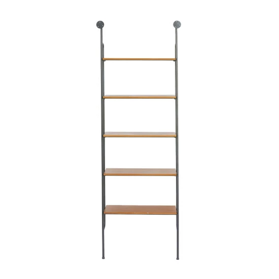 - This industrial style accent furniture features 5-tier wall storage with rectangular wooden shelves and solid metal side frames