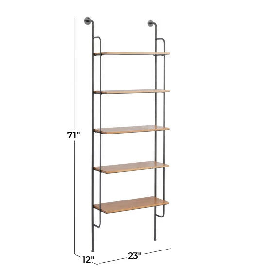 Accessorize your living space and bring a feel-good vibe with this functional wall shelf that provides optimal storage solution. Utilize your wall space to add more storage for a space saving solution in any compact area. Maintain an organized home to create comfort and a welcoming atmosphere. This item comes shipped in one carton. Item comes with round metal plates with screw slots. Suitable for indoor use only. This furniture has 5 shelves. Industrial Design. Item has max weight of 15 lbs.