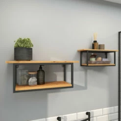 These Chinese fir wood two-level floating shelves fill the empty places on your industrial-themed wall. Just attach the iron frames using screws. They can carry books, artworks, collectibles, toys, trophies, potted indoor plants, and other surface decors. They can also work as floating desks designed to save space in the lower part of the wall. This item comes shipped in one carton. Shelves attach to wall via screws. Easy to hang with 2 back keyhole hooks each. Suitable for indoor use only. Holds up to 20 lbs. Each set comes with 2 metal and wood shelves. Designed with an industrial theme.