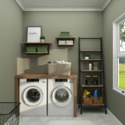 - This industrial wall shelf highlights a light natural wood brown finish and obsidian black frame finish