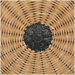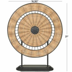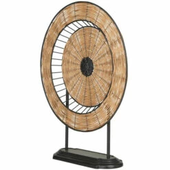 - Natural decorative sculpture featuring a round design with woven rattan details that give the illusion of a rotating wheel with metal stand and tiered base
