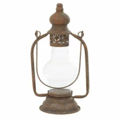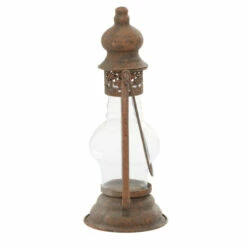 IInfuse your space in the romantic candlelight glow that emits from this brown metal candle lantern. This piece is a great addition to any traditional-inspired interior and will surely complement your existing home decors. With its segmented body with brown metallic frame along with finial and handle, this candle holder works beautifully on any mantel, countertop, or accent table. Made of iron and glass, this accent piece provides solid construction and is perfect for creating an elegant adornment or centerpiece for a festive celebration. Delight your guests and make any occasion extra special by adding a lighted candle to this stunning metal and glass candle lantern. This item ships in 1 carton. Metal secure loop backing for easy hang. Suitable for indoor use only. Rustic Design. Lantern candle holder which can hold 1 pillar candle.