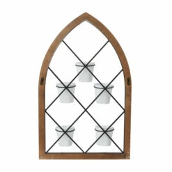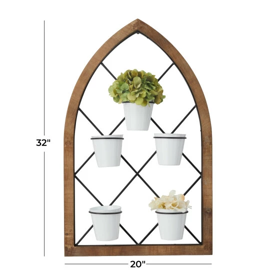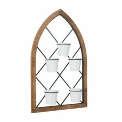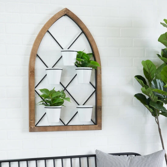 - This arched wall decor comes in a brown wooden frame, black metal grill, and white plant containers