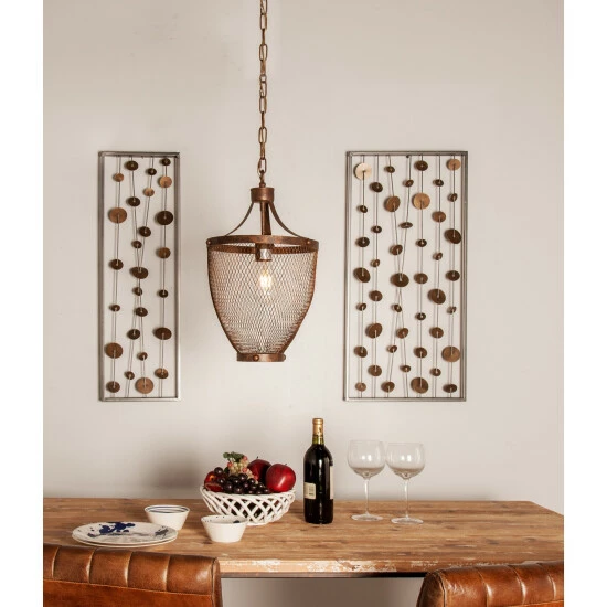 Jazz up your home interior with elegance with this metal chandelier from Studio 350! Featuring a funnel-shaped body with tapered mesh shade, this lovely piece is a great addition to your rustic-themed settings. It also features a bulb mount connected to a small round mid suspension with three arched bands for a traditional look. The metallic bronze finish dusted with gold accents brings out the style of this chandelier. It is made of 100% iron material that guarantees a long-lasting quality even when exposed to rough conditions. This home dΓ©cor is also designed with an iron rod for safe and easy installation. Make your homes even brighter by hanging this metal chandelier today!