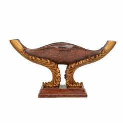 - A decorative bowl for home featuring a curved structure furnished with a brown wood style bowl and rectangular tiered base along with a bronze abstract style frame with line markings