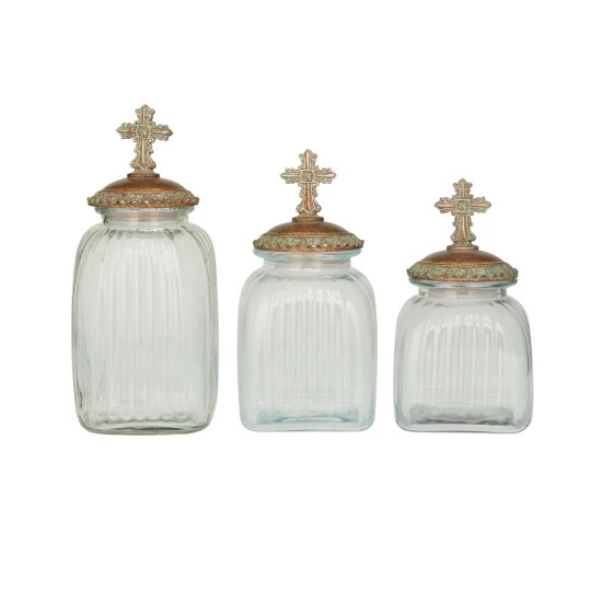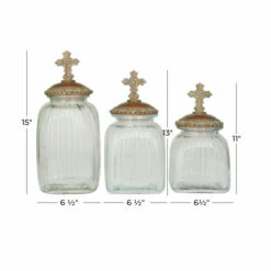 - Set of transparent cylindrical glass canisters in varying heights with brown polystone lids designed with eye-catching cross-inspired handles with beautiful flourishes