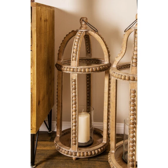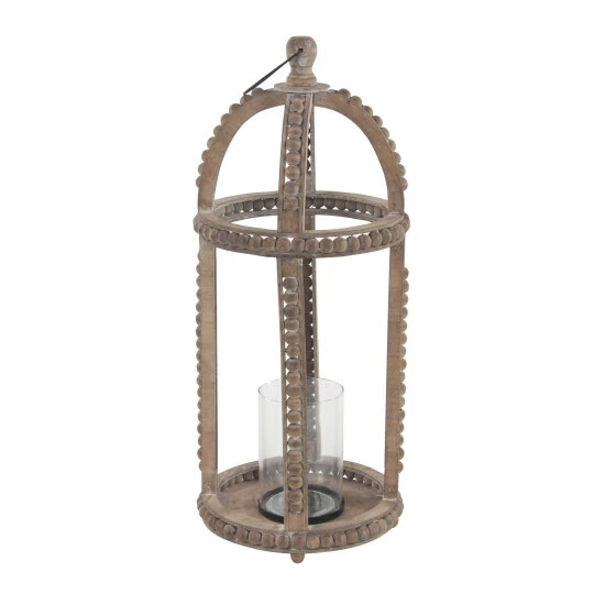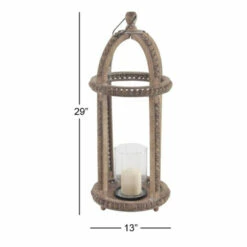 Enhance the rustic charm of your living space with the unique styling of this stunning farmhouse lantern. The lantern is crafted from reclaimed wood with an arched top, carved orb detailing along the open frame, and a natural brown finished enhanced with occasional whitewashed highlights. A cylindrical glass candle shade in the center of the lantern completes this chic design.