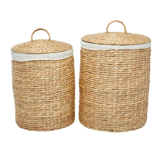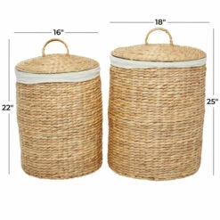 Offer any traditional themed home a final touch by displaying this set of storage baskets that can hold embellishments or belongings. Keep your space tidy and neat with the help of these storage baskets. Place them by your bedside, laundry room or living room to keep your space free of clutter. This item comes shipped in one carton. Suitable for indoor use only. Made in Vietnam. This set comes with 2 baskets. Traditional Style.. A traditional inspired designed for classic harmony full of friendly charm. These light brown storage baskets are crafted of natural seagrass and water hyacinth materials. These round baskets with lids come in light brown and white finishes that suit a traditional interior. A set of 2 storage woven baskets featuring round bodies with deep setting and round lids with easy grip handles. Each item measures 18″L x 18″W x 25″H, 16″L x 16″W x 22″H and weighs 13 lbs