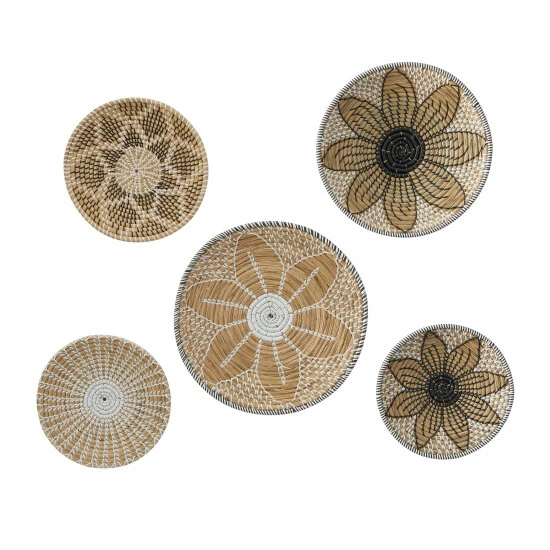 - A variety of radial and floral woven details adorn each of the 5 plates of this seagrass wall decor set