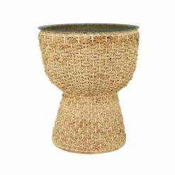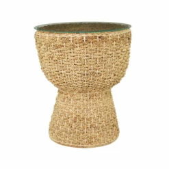 - Dried water hyacinth braids adorn the frame of this accent table complemented with a glass table top