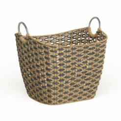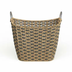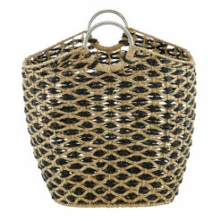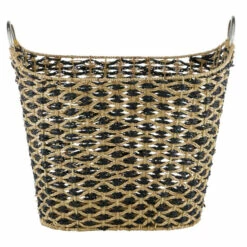 This contemporary style large wicker basket is handwoven from natural beige flats edge wicker, a natural Vietnamese seagrass with a smooth texture. The wicker rope is braided into horizontal bands to form the firm, non-collapsible body, creating a durable, large basket for heavy items. The unique rounded rectangular shape boasts tall sides, a curved silhouette, a black diamond pattern, and chic circular metal handles. This decorative basket offers both a neutral-toned decorative basket in natural spaces, as well as a Contemporary style living room or bathroom storage basket. This item comes shipped in one carton. Easy-carry, sturdy steel handles. Due to the handmade nature of this item, no two will be alike, there will be slight differences in shape, size, and color. Suitable for indoor use only. Made in Vietnam. Bohemian theme.