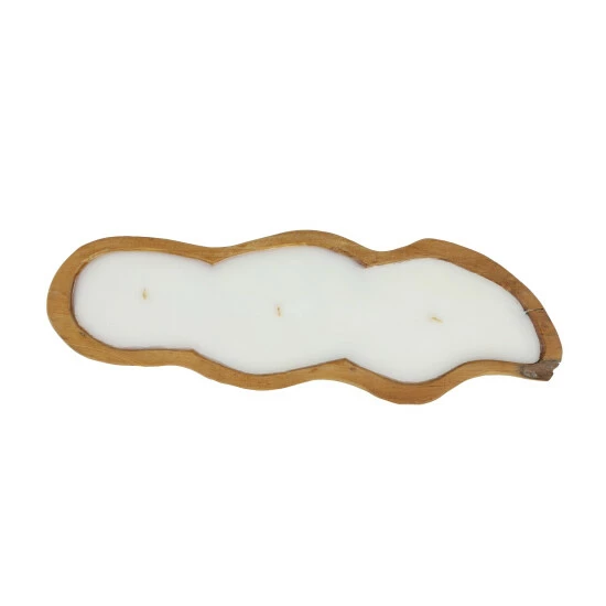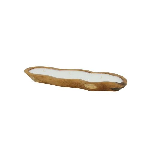 After your burn through your white candles, reuse this wooden vessel as beautiful natural home decor statement piece or as a large, long wood bowl. Illuminate your entire space with this eye catching candle . Make a statement with this unique lamp on mantle, console table or in any living space. This decorative candle tray holds one wide candle with three wicks. This item comes shipped in one carton. Hypoallergenic, non-scented candles. Suitable for indoor use. Made in Indonesia. Natural design.