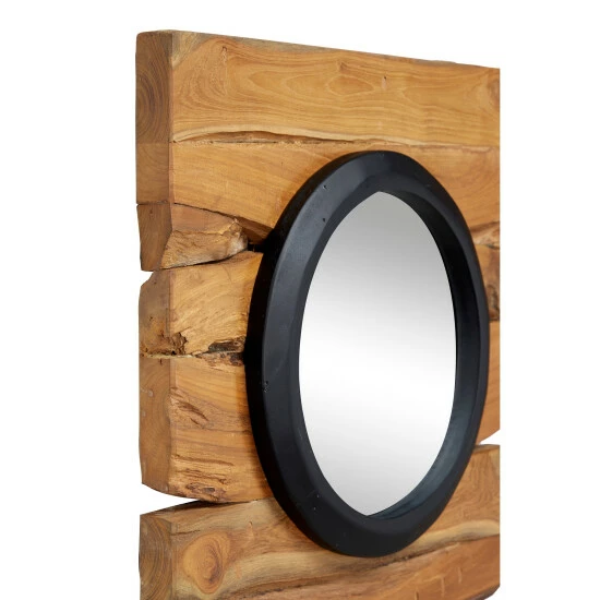 - A teak wood hanging wall mirror set with square wooden frames, round clear reflective glass panels, and exposed wood grain
