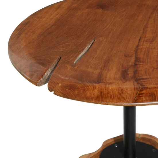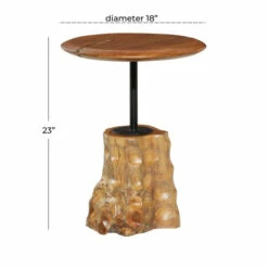Give your modern inspired living space a fresh perspective with this round brown teak wood side table with Tatah wood base and appreciate true vintage beauty. This wood and metal side table features a round table surface in a brown finish. The table surface is connected to the elegant Tatah wood base with a sleek iron pole giving the entire structure excellent stability at no cost to its beauty. Place this side table in your modern inspired home and feel the rich vintage vibes it exudes. This item comes shipped in 1 carton. Suitable for indoor use only. Maximum weight limit is 100 lbs. Made in Indonesia. Contemporary design.