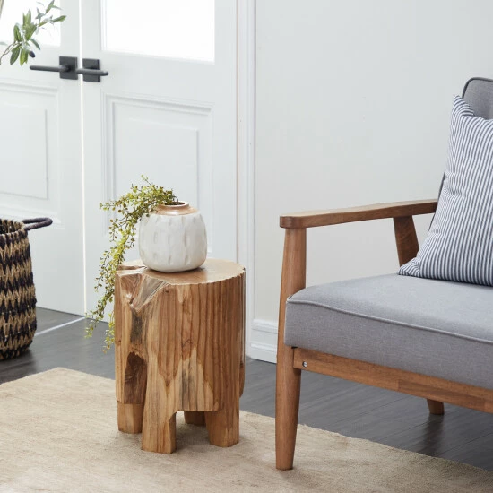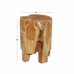 This table’s petite stature with tray like top ensure no items will slip away. This versatile piece will be a great addition to your contemporary or rustic home with light solid-colored backgrounds. This item is shipped in one carton. Suitable for indoor use only. Maximum weight limit is 100 lbs. Made in Indonesia. This stool sits 1 person. Contemporary design. The one-of-a-kind item you have purchased is made from the stumps and unused trunks of harvested teak trees. This teak comes from ecologically managed forests. Once the tree is harvested, the remaining stumps must be removed to make space to plant replacement trees. In the past, these pieces would be harvested and then burned to dispose of them, which created pollution. Today we use these tree stumps and trunks to create beautiful, handcrafted pieces for your home. Coloring, cracks, and shapes will vary between items. Each one is unique and the artisan works to bring out the inner beauty within the tree to become a cherished piece of art for your home..