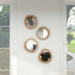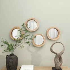 Complete your naturalist inspired living space with this 4-piece set naturalist style round brown wood tree stump wall mirrors. The frame of this mirror is made from tree stumps where the internal tree rings were cut out and replace with a circular mirror instead. The beauty lies on the natural tree bark texture and brown finish of these mirrors. They will look good in any room of your naturalist inspired home with other decor in the same genre or color pattern. This item comes shipped in one carton. Easy-to-hang feature with its D-ring hardware at the back. Suitable for indoor use only. Made in Indonesia. Each set includes 4 wall mirrors. Rustic Design.. Designed with a rustic theme influence for cozy and organic feel. Mirror frame is made from natural tree stump complete with tree bark and some tree rings. This remarkable set of teak wood mirrors come in a naturally textured brown wooden finish. Features a natural tree stump frame with the real texture and finish of tree bark. Each wall mirror measures 13″L x 13″H x 3″W and individually weighs 15 lbs