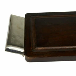 - Each tray features a wooden slab with its natural wood graining patterns accented with pull handles on each side
