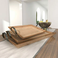- These decorative trays highlight natural wood brown frame finish