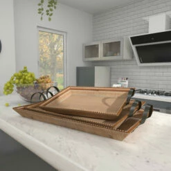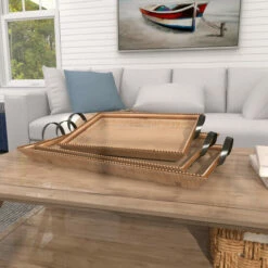 Get organizing and decorating a laid back vibe with these carved wood trays placed on your coastal-themed counters or console tables. Whether in your kitchen, or on your coffee table, it’s a great way to display and store your favorite things. A storage piece that is spacious for your trinkets or decorative goods on your mantle, coffee table or kitchen counter. This item comes shipped in one carton. Please note that this item is for decorative purpose use only and are not food safe. Suitable for indoor use only. This is a 3-in-1 wooden tray set. Coastal theme.